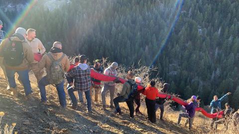 Time stood still as we patiently watched while Follow the Flag team members gathered in number to secure The Major onto the strong cables--- stretching across from one end of Coldwater Canyon to the other. Waiting…waiting…the cold seeps in again. Our bodies move and jostle around, trying to stay warm. We greet and talk to each other and make conversation as our breath freezes in the air. I sat down next to Tammy and Steve Taylor, parents of Major Brent Taylor. Both were cheerful, humble, and exude kindness—even making me laugh. Salt of the earth people. There were were—all of us together-- focused on the canyon below.