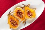 Remove cooked pears from pan, and place on dish. Put slice of Cache Valley® Cheddar Cheese, bacon crumbles and candied walnuts on each pear.
