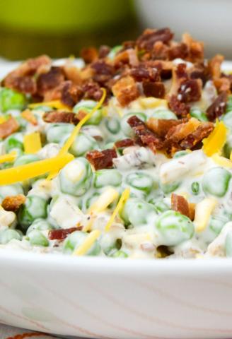 In a salad bowl, add bacon, onion, cheddar and ranch dressing. Toss well to evenly coat all ingredients. Add peas and chopped eggs and gently fold into mixture, so they don't get mushy. Cover and place in the refrigerator 30 minutes minimum up to overnight. Serve.