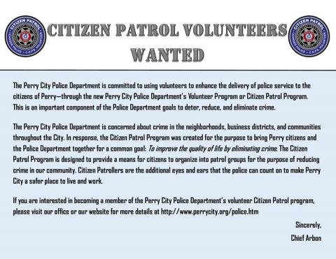 Hey Perry Residents! Perry Police are looking for 30 Citizen Patrol members. If you, or anyone you know, is interested, please message us your/their contact information: name, address, phone, and e-mail! Thanks! http://www.perrycity.org/police.htm