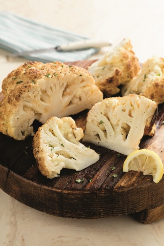 To serve, cut whole cauliflower in half, then cut each half into 4 pieces.